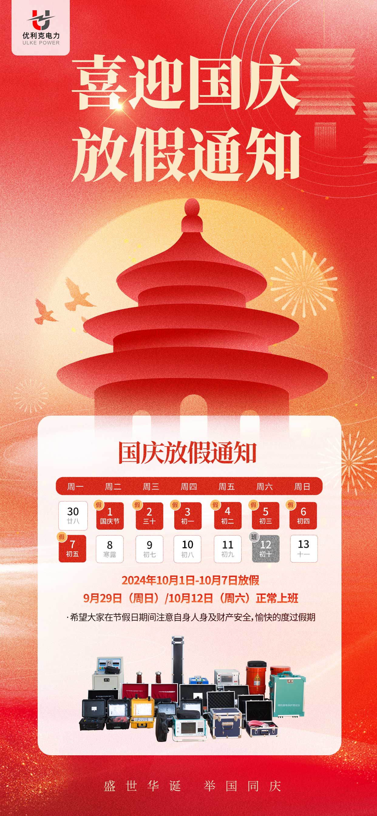 感謝您一直以來對優利克電力的支持與信任。我們將一如既往地為您提供優質的產品和服務。國慶節期間給您帶來的不便,敬請諒解。