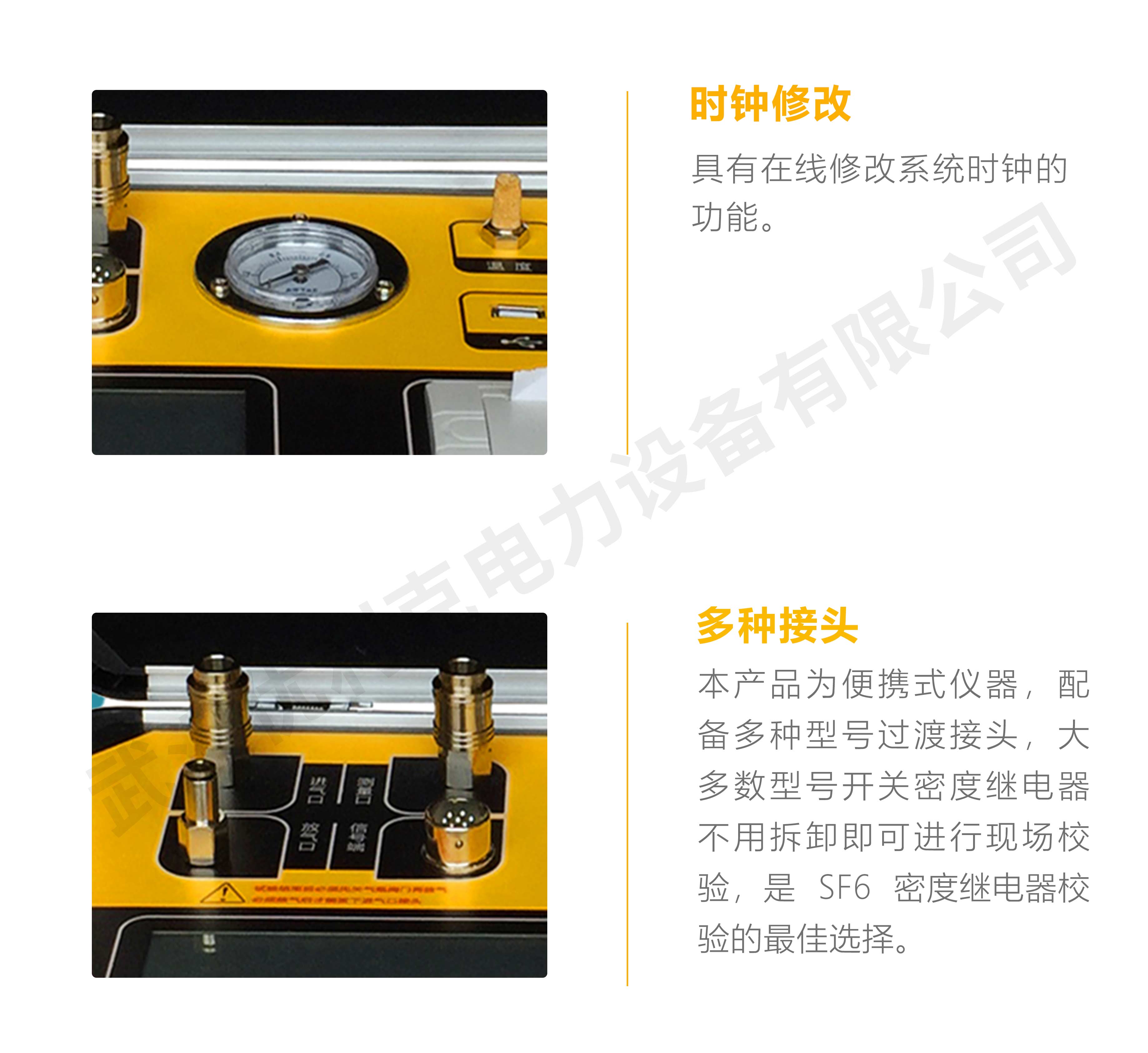 5、配套過渡接頭全:本產品為便攜式儀器,配備多種型號過渡接頭,大多數型號開關密度繼電器不用拆卸即可進行現場校驗,是 SF6 密度繼電器校驗的最佳選擇。